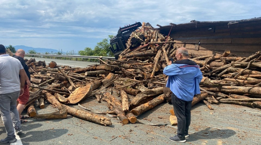 Öte yandan devrilen TIR'ın kasasındaki ağaç parçalarının etrafa saçılması nedeniyle ulaşım tek şeritten kontrollü sağlandı.