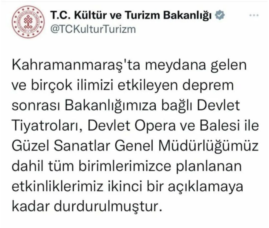 "Kahramanmaraş'ta meydana gelen ve birçok ilimizi etkileyen deprem sonrası bakanlığımıza bağlı Devlet Tiyatroları, Devlet Opera ve Balesi ile Güzel Sanatlar Genel Müdürlüğümüz dahil tüm birimlerce planlanan etkinliklerimiz ikinci bir açıklamaya kadar durdurulmuştur. "