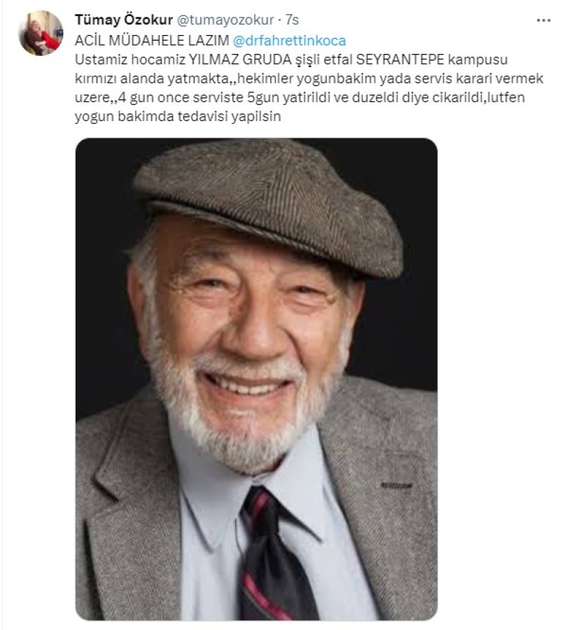 "Ustamız, hocamız Yılmaz Gruda Şişli Etfal Seyrantepe Kampusu kırmızı alanda yatmakta... Hekimler yoğun bakım ya da servise karar vermek üzere... 4 gün ilkin serviste 5 gün yatırıldı ve düzeldi diye çıkarıldı. Lütfen yoğun bakımda tedavisi yapılsın"