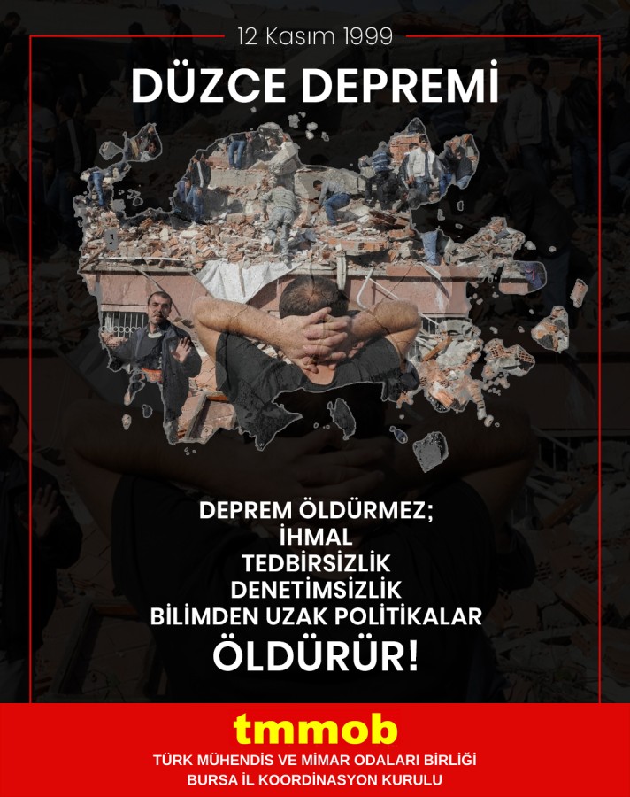 "TMMOB Bursa İl Koordinasyon Kurulu olarak, 12 Kasım 1999 tarihinde Düzce'de meydana gelen 7,2 büyüklüğündeki depremde yaşamını yitiren 850 yurttaşımızı saygı ve rahmetle anıyor, yaralanan ve evsiz kalan binlerce yurttaşımıza bir kez daha geçmiş olsun dileklerimizi iletiyoruz.