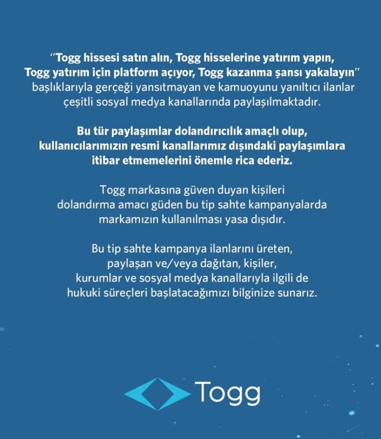 Konuya ilişkin bilgilendirmede, bu tür paylaşımların dolandırıcılık amaçlı olup, kullanıcıların resmi kanallar dışındaki paylaşımlara itibar etmemelerine dikkat çekildi. Açıklamada, "Togg markasına güven duyan kişileri dolandırma amacı güden bu tip sahte kampanyalarda markamızın kullanılması yasa dışıdır. Bu tip sahte kampanya ilanlarını üreten paylaşan veya dağıtan, kişiler kurumlar ve sosyal medya kanallarıyla ilgilide hukuki süreçler başlatacağımızı bilginize sunarız" denildi.