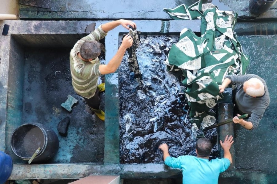 Baskı yapılan bezler, su dolu havuzlarda geleneksel yöntemlerle ayakla çiğnenerek yıkanıyor. Ardından korkuluklara asılan yazmalar kurutulmaya bırakılıyor.