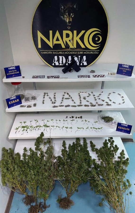 5 şüpheli gözaltına alındı, adreslerde yapılan aramalarda 789,28 gram esrar, bin 37 uyuşturucu hap, 117 kök Hint keneviri, 0,99 gram bonzai, ruhsatsız tabanca ve 5 mermi ele geçirildi.