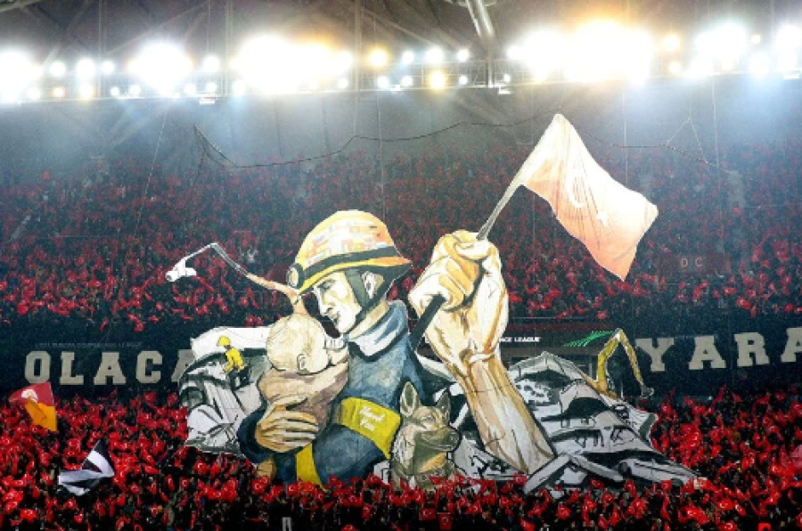 Karşılaşma öncesi tribünde "Hep birlikte olacağız, yaraları saracağız." ifadesinin yer aldığı bir arama kurtarma görevlisi ve kucağında enkazdan çıkarılan bir bebeğin bulunduğu görselin yer aldığı koreografi sergilendi.