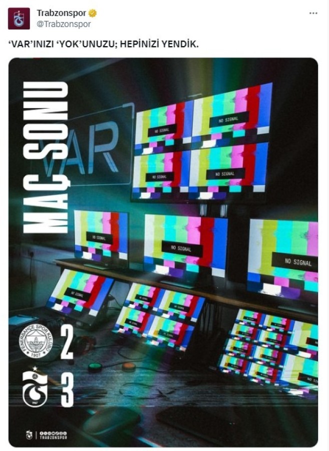 Trabzonspor'un yaptığı paylaşımda, "'VAR'INIZI 'YOK'UNUZU; HEPİNİZİ YENDİK" denildi.