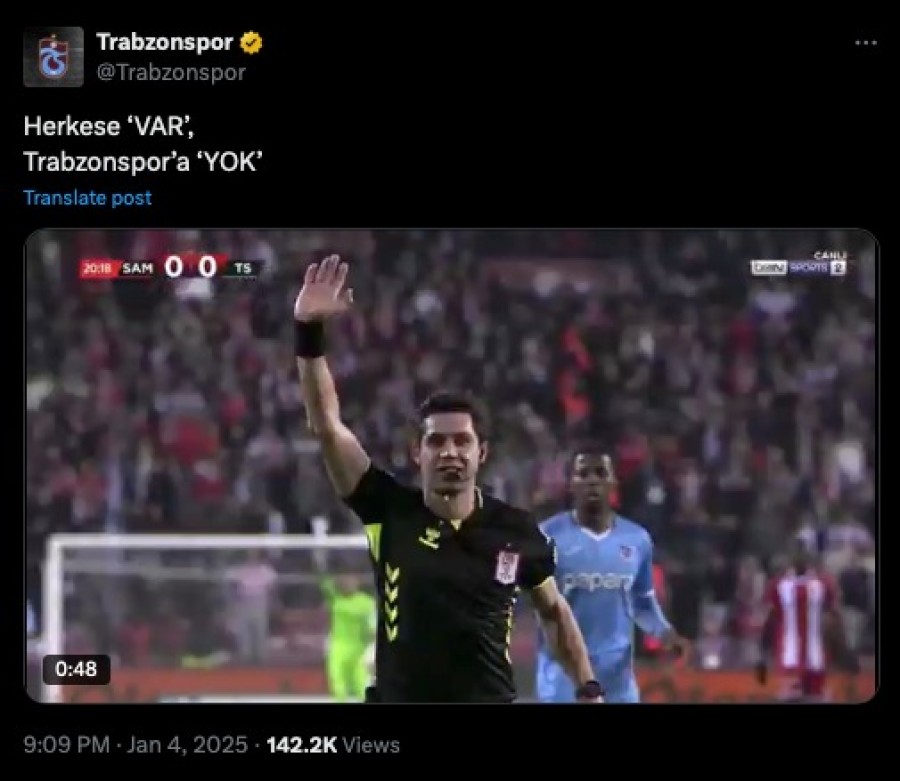 Trabzonspor, Samsunspor maçının ilk yarısındaki bir pozisyon için hakem yönetimine tepki gösterdi. Bordo-mavili takımın açıklamasında, "Herkese 'VAR' Trabzonspor'a 'YOK'" ifadelerine yer verdi.