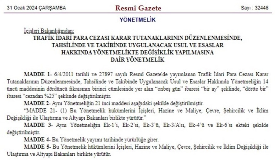 Cumhurbaşkanı Recep Tayyip Erdoğan'ın imzasıyla Resmi Gazete'de yayımlanan karara göre trafik cezalarında indirimli ödeme süresi 15 günden 1 aya çıkarıldı.