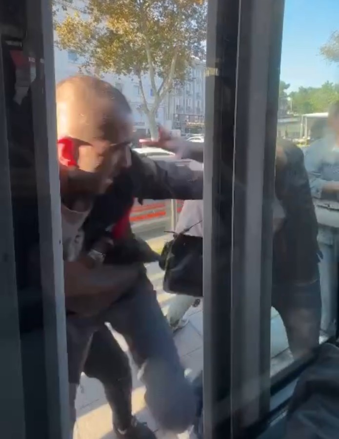 Boks müsabakasını andıran görüntüler tramvayda bulunan bir yolcu tarafından cep telefonu kamerasıyla kaydedildi.
