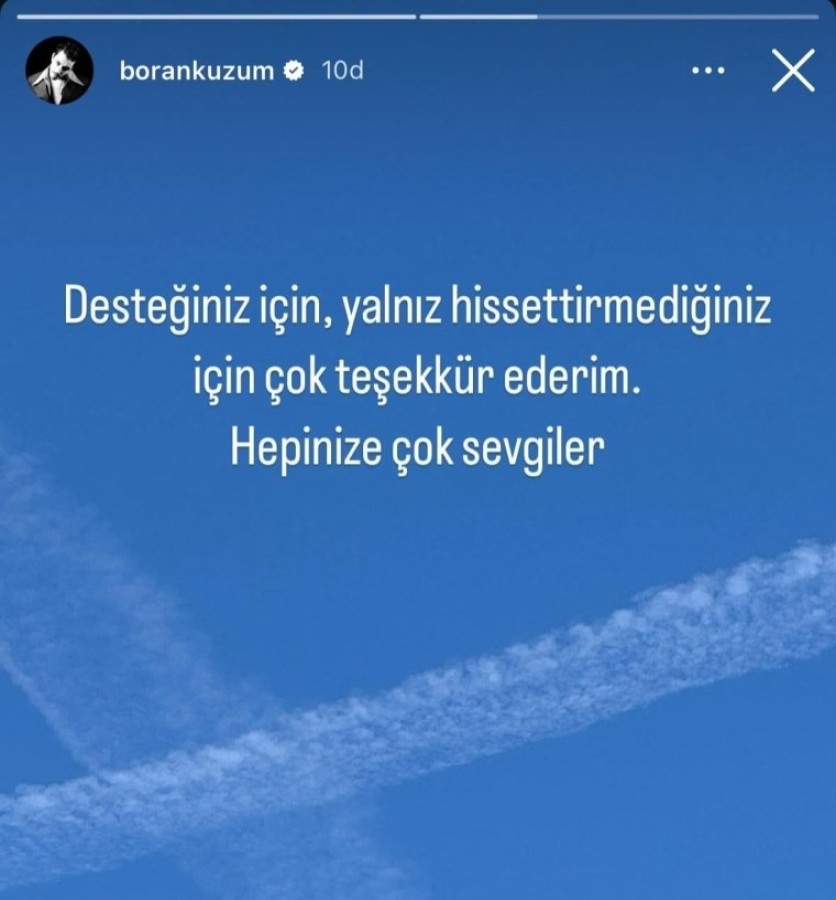 Boran Kuzum, geçtiğimiz günlerde Aybüke Pusat'a verdiği destekle gündeme gelmişti. Pusat, boykot paylaşımı yaptığı için TRT'nin Teşkilat dizisinden çıkarılmıştı. Oyuncu Kuzum, sosyal medya hesabından Pusat'ı paylaşarak "Canım, güzel insan" şeklinde bir mesaj yazmıştı.