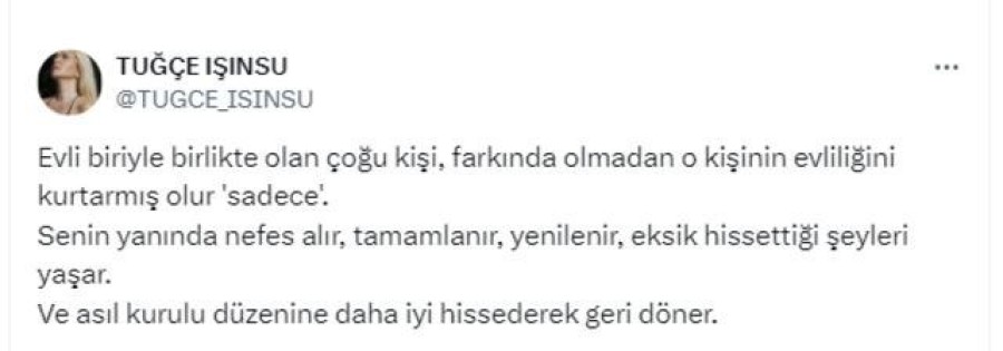 Işınsu paylaşımında, "Evli biriyle birlikte olan çoğu kişi, farkında olmadan o kişinin evliliğini kurtarmış olur 'sadece'. Senin yanında nefes alır, tamamlanır, yenilenir, eksik hissettiği şeyleri yaşar. Ve asıl kurulu düzenine daha iyi hissederek geri döner." ifadelerini kullandı.