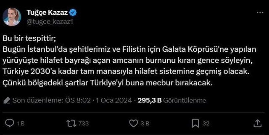 Eski manken paylaşımında "Bu bir tespittir; İstanbul'da şehitlerimiz ve Filistin için Galata Köprüsü'ne yapılan yürüyüşte hilafet bayrağı açan amcanın burnunu kıran gence söyleyin, Türkiye 2030'a kadar tam manasıyla hilafet sistemine geçmiş olacak. Çünkü bölgedeki şartlar Türkiye'yi buna mecbur bırakacak" dedi.