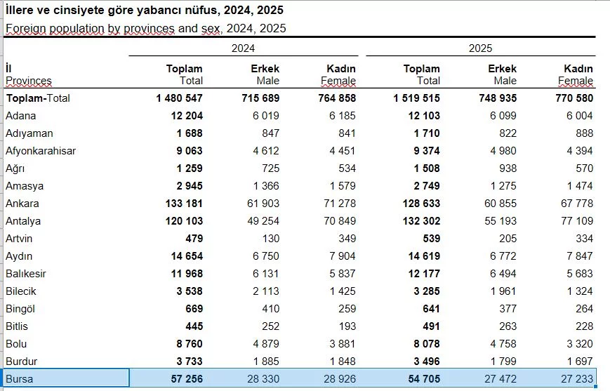 TÜİK verilerine göre Bursa'da yaşayan yabancıların nüfusu, 2024-2025 döneminde 2 bin 551 kişi azalarak 57 bin 256'dan 54 bin 705'e geriledi.
