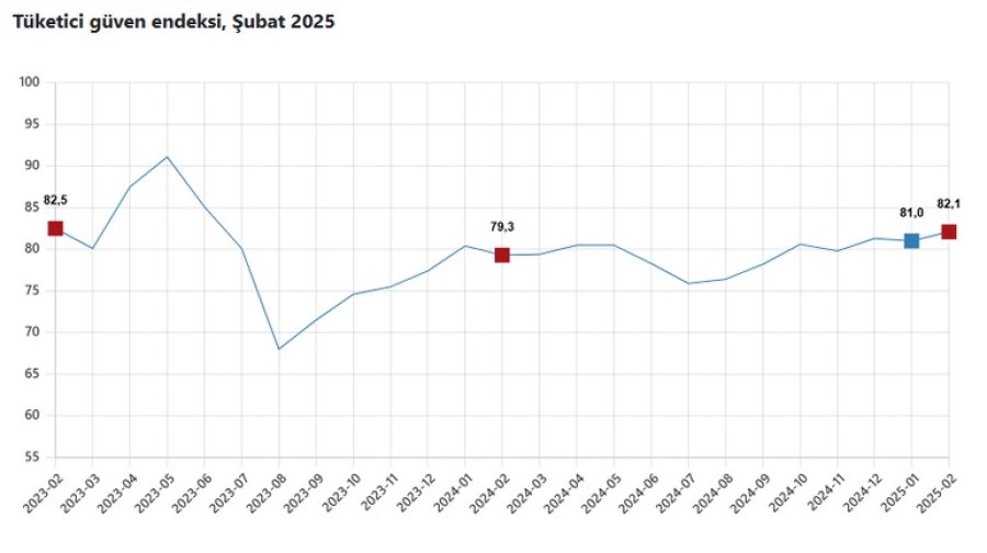 Türkiye İstatistik Kurumu ve Türkiye Cumhuriyet Merkez Bankası işbirliği ile yürütülen tüketici eğilim anketi sonuçlarından hesaplanan tüketici güven endeksi, Ocak ayında 81,0 iken Şubat ayında yüzde 1,4 oranında artarak 82,1 oldu.