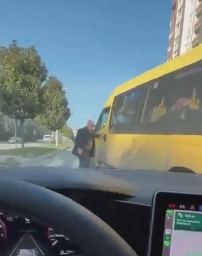 Yolda aracını yan şekilde durdurarak cipin önünü kesen minibüs sürücüsü, cipe vurarak sürücü kapısını açmaya çalıştı.