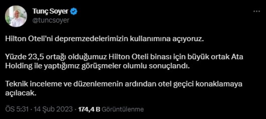 "Hilton Oteli'ni depremzedelerimizin kullanımına açıyoruz. Yüzde 23,5 ortağı olduğumuz Hilton Oteli binası için büyük ortak Ata Holding ile yaptığımız görüşmeler olumlu sonuçlandı. Teknik inceleme ve düzenlemenin ardından otel geçici konaklamaya açılacak."