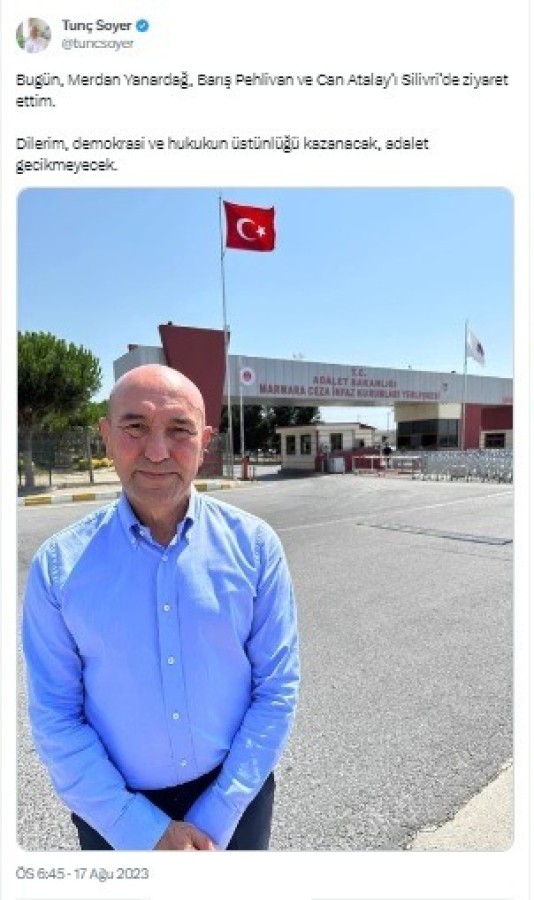 Marmara ceza infaz kurumu önünde çekilen fotoğrafıyla X'te paylaşım yapan Soyer, "Dilerim, demokrasi ve hukukun üstünlüğü kazanacak, adalet gecikmeyecek" ifadelerine yer verdi.