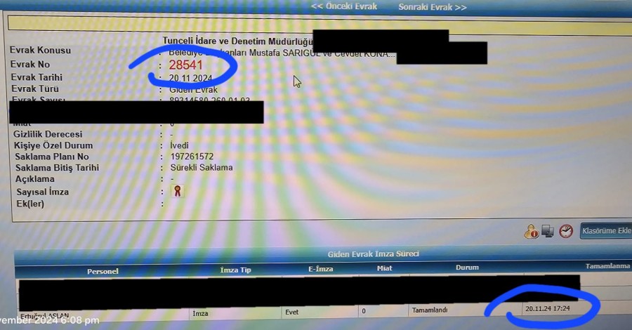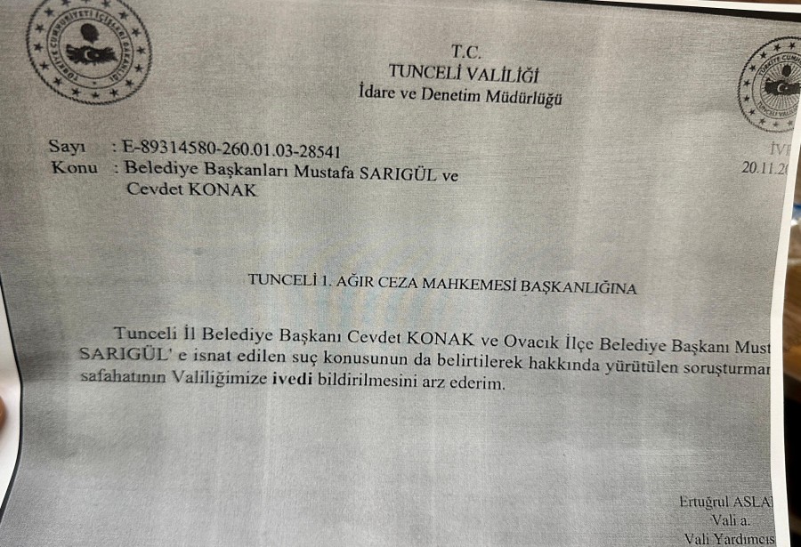 Cevdet Konak, Tunceli Valiliği tarafından davanın sürdüğü sırada mahkemeye evrak gönderildiğini öne sürerek, "Dün mahkeme devam ederken Tunceli Valiliği tarafından, Tunceli 1'inci Ağır Ceza Mahkemesi Başkanlığı'na gönderilen bir yazı var. Yazıda 'Tunceli İl Belediye Başkanı Cevdet Konak ve Ovacık İlçe Belediye Başkanı Mustafa Sarıgül'e istinat edilen suç konusunda, hakkında yürütülen soruşturmanın safahatı valiliğimize ivedi bildirilmesi arz ederim' deniliyor.