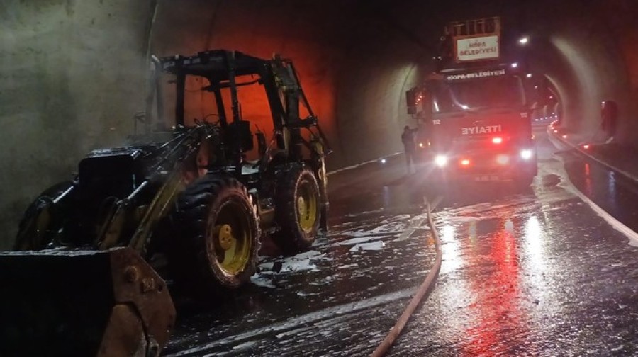 Artvin'in Hopa ilçesinde, tünel içinde seyir halinde olan iş makinesi alev alarak kullanılamaz hale geldi.