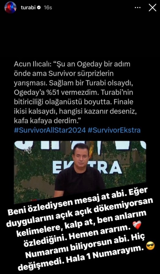 Acun Ilıcalı, All Star'ın geçtiğimiz günlerde gerçekleşen acil durum konseyinde, Turabi Çamkıran'ın Survivor'dan ayrıldığını duyurmuştu. Sakatlığı sebebiyle Survivor All Star 2024'e veda eden Turabi, geçtiğimiz günlerde yoğun bakıma alındığını söylemişti.