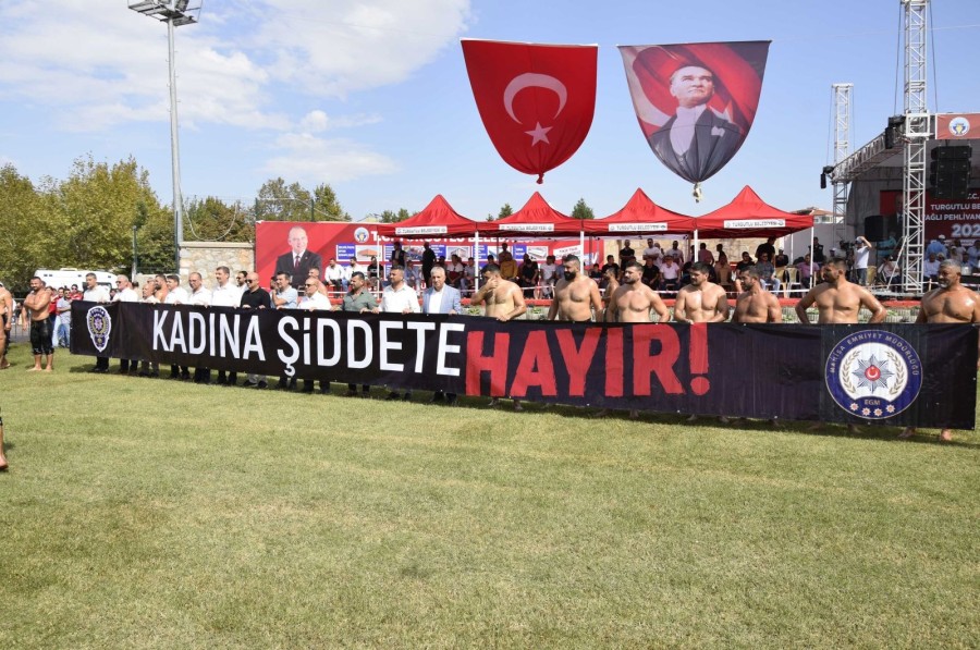 Güreşe katılan başpehlivanlar, Manisa İl Emniyet Müdürlüğü tarafından hazırlanan "Kadına Şiddete Hayır!" yazılı pankartla er meydanına çıktı.