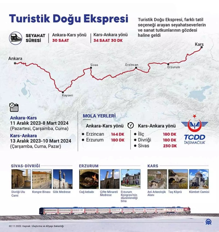 Turistik Doğu Ekspresi'nin sezonu, Ulaştırma ve Altyapı Bakanlığı tarafından başlatıldı. İlk sefer bugün Ankara'dan Kars'a gerçekleşiyor.