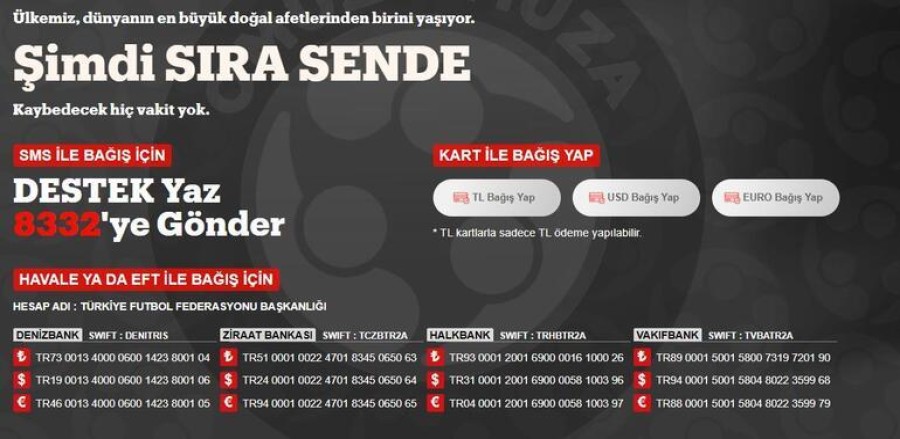 "Ülkemiz büyük bir felaketle karşı karşıya kaldı. Birçok canımızı kaybettik. Yaralarının sarılmasını bekleyen birçok insanımız var. Onlara destek vermek, acılarını bir nebze hafifletmek için futbol camiası olarak 'omuz omuza' veriyoruz.