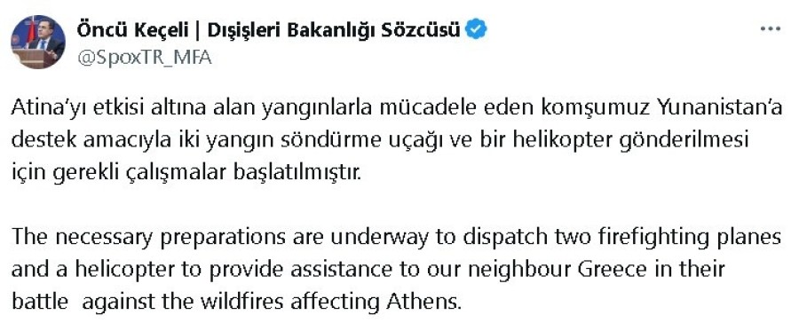 Sözcü Keçeli, sosyal medya hesabından yaptığı açıklamada, "Atina'yı etkisi altına alan yangınlarla mücadele eden komşumuz Yunanistan'a destek amacıyla iki yangın söndürme uçağı ve bir helikopter gönderilmesi için gerekli çalışmalar başlatılmıştır" ifadelerini kullandı.