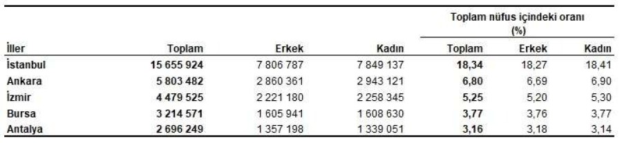 İstanbul'un nüfusu, bir önceki yıla göre 252 bin 27 kişi azalarak 15 milyon 655 bin 924 kişi oldu. Türkiye nüfusunun %18,34'ünün ikamet ettiği İstanbul'u, 5 milyon 803 bin 482 kişi ile Ankara, 4 milyon 479 bin 525 kişi ile İzmir, 3 milyon 214 bin 571 kişi ile Bursa ve 2 milyon 696 bin 249 kişi ile Antalya izledi.