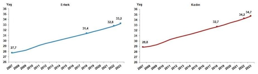 Türkiye'de 2022 yılında 33,5 olan ortanca yaş, 2023 yılında 34'e yükseldi. Cinsiyete göre incelendiğinde, ortanca yaşın erkeklerde 32,8'den 33,2'ye, kadınlarda ise 34,2'den 34,7'ye yükseldiği görüldü.