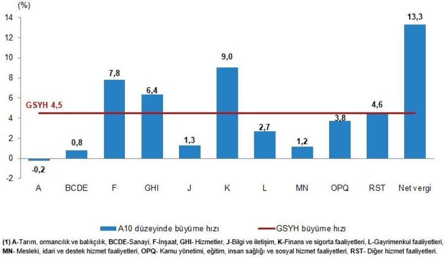 GSYH'yi oluşturan faaliyetler incelendiğinde; 2023 yılında bir önceki yıla göre zincirlenmiş hacim endeksi olarak; finans ve sigorta faaliyetleri toplam katma değeri Yüzde 9,0, inşaat Yüzde 7,8, hizmetler Yüzde 6,4, diğer hizmet faaliyetleri Yüzde 4,6, kamu yönetimi, eğitim, insan sağlığı ve sosyal hizmet faaliyetleri Yüzde 3,8, gayrimenkul faaliyetleri Yüzde 2,7, bilgi ve iletişim faaliyetleri Yüzde 1,3, mesleki, idari ve destek hizmet faaliyetleri Yüzde 1,2 ve sanayi Yüzde 0,8 arttı. Tarım sektörü ise Yüzde 0,2 azaldı.