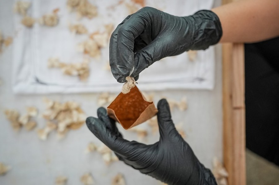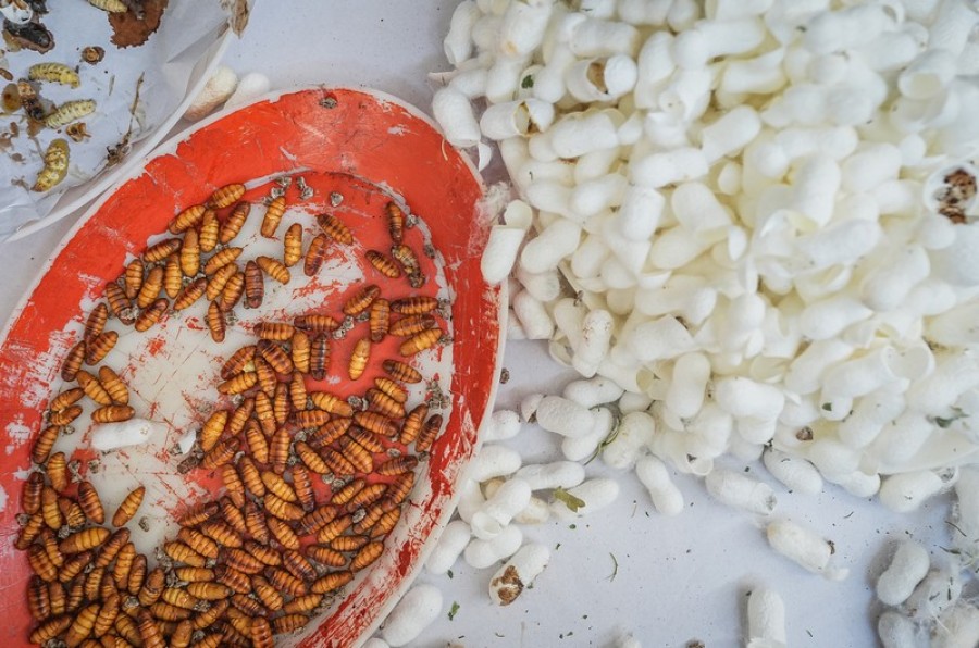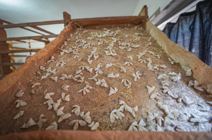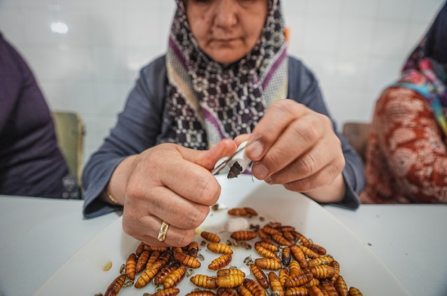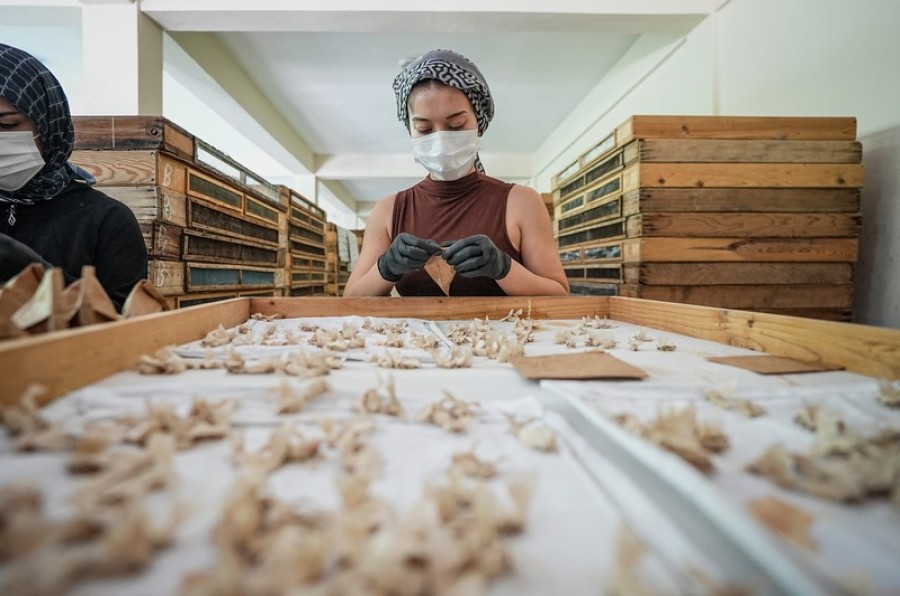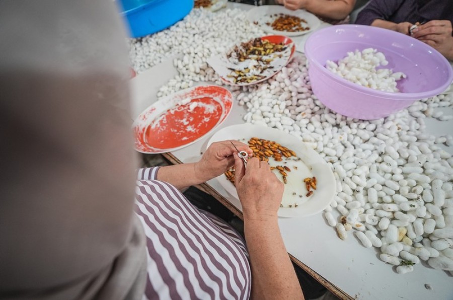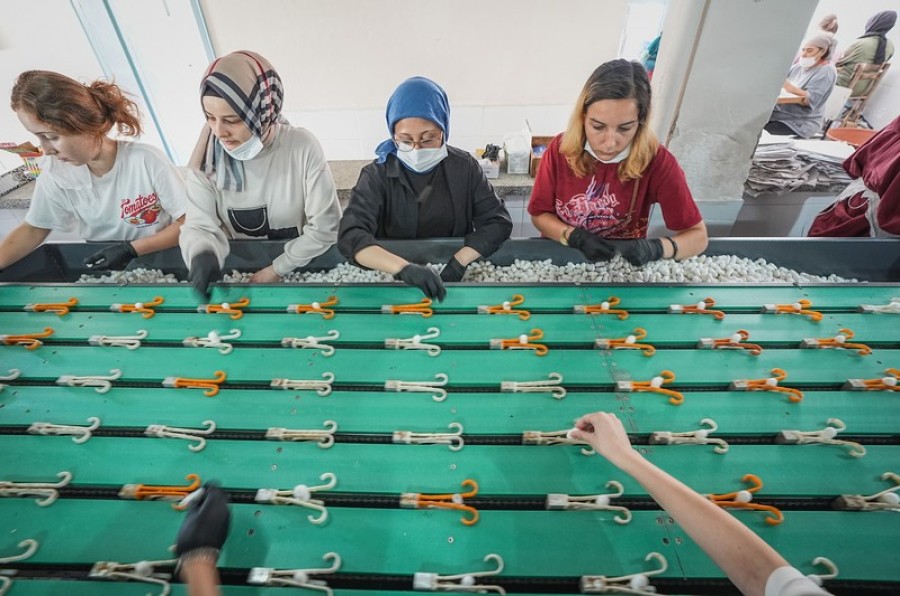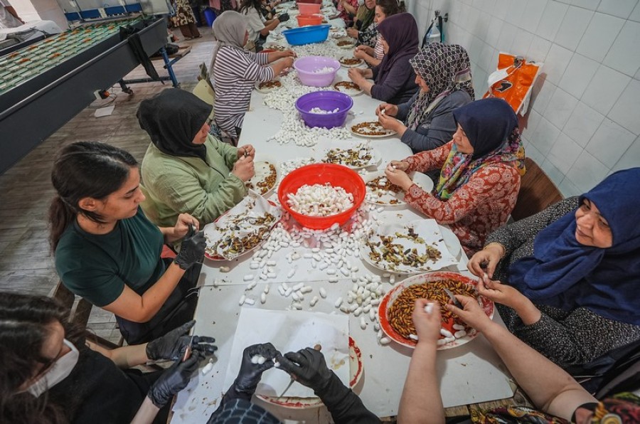 Köylerde yetiştiricilik yapan ailelerden alınarak işletmeye getirilen kozalar, burada işçiler tarafından tek tek kesiliyor. Bu kozalardan çıkarılan krizalitler (kelebek olmadan önce bir böceğin, koza veya kozasız olarak geçirdiği başkalaşma durumu) cinsiyet ayrımına tabi tutuluyor.