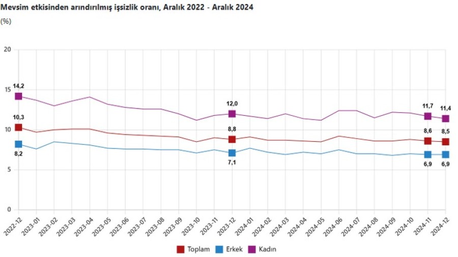 Türkiye'de işsizlik oranı, Aralık 2024'te bir önceki aya göre 0,1 puan azalarak yüzde 8,5 oldu.