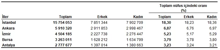 İstanbul'un nüfusu, bir önceki yıla göre 52 bin 451 kişi artarak 15 milyon 754 bin 53 kişi oldu. Türkiye nüfusunun %18,3'ünün ikamet ettiği İstanbul'u, 5 milyon 910 bin 320 kişi ile Ankara, 4 milyon 504 bin 185 kişi ile İzmir, 3 milyon 263 bin 11 kişi ile Bursa ve 2 milyon 777 bin 677 kişi ile Antalya izledi.