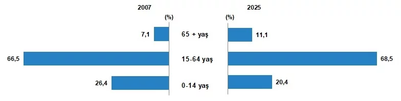 Çalışma çağındaki nüfusun oranı %68,5 olduÇalışma çağı olarak tanımlanan 15-64 yaş grubundaki nüfusun oranı, 2007 yılında %66,5 iken 2025 yılında %68,5 oldu. Diğer yandan çocuk yaş grubu olarak tanımlanan 0-14 yaş grubundaki nüfusun oranı %26,4'ten %20,4'e gerilerken, 65 ve daha yukarı yaştaki nüfusun oranı ise %7,1'den %11,1'e yükseldi.