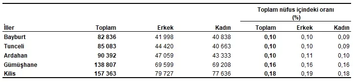 Nüfusu en az olan il 82 bin 836 kişi ile Bayburt olduBayburt, 82 bin 836 kişi ile en az nüfusa sahip olan il oldu. Bayburt'u, 85 bin 83 kişi ile Tunceli, 90 bin 392 kişi ile Ardahan, 138 bin 807 kişi ile Gümüşhane ve 157 bin 363 kişi ile Kilis takip etti.