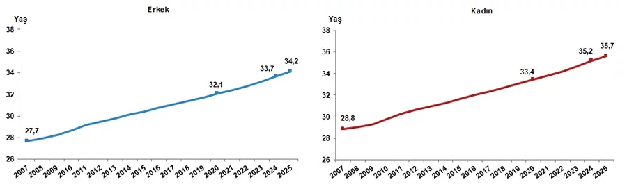 Türkiye'de 2024 yılında 34,4 olan ortanca yaş, 2025 yılında 34,9'a yükseldi. Cinsiyete göre incelendiğinde, ortanca yaşın erkeklerde 33,7'den 34,2'ye, kadınlarda ise 35,2'den 35,7'ye yükseldiği görüldü.