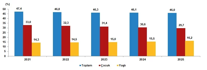 Toplam yaş bağımlılık oranı azaldıÇalışma çağındaki birey başına düşen çocuk ve yaşlı birey sayısını gösteren toplam yaş bağımlılık oranı, 2024 yılında %46,1 iken 2025 yılında %46'ya düştü. Çalışma çağındaki birey başına düşen çocuk sayısını ifade eden çocuk bağımlılık oranı, %30,6'dan, %29,7'ye gerilerken, çalışma çağındaki birey başına düşen yaşlı birey sayısını ölçen yaşlı bağımlılık oranı ise %15,5'ten %16,2'ye yükseldi. Diğer bir ifadeyle, Türkiye'de 2025 yılında, çalışma çağındaki her 100 kişi, 29,7 çocuğa ve 16,2 yaşlıya bakmaktadır.