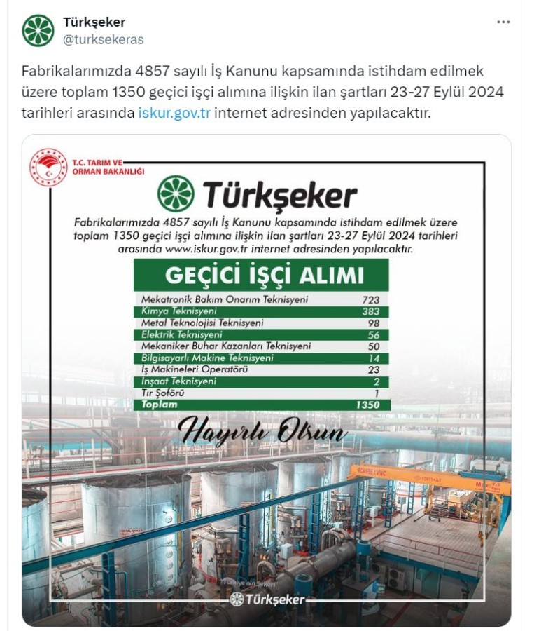 Şirketin sosyal medya hesabından yapılan açıklamada, "Fabrikalarımızda 4857 sayılı İş Kanunu kapsamında istihdam edilmek üzere toplam 1350 geçici işçi alımına ilişkin ilan şartları 23-27 Eylül 2024 tarihleri arasında 'http://iskur.gov.tr' internet adresinden yapılacaktır" denildi.