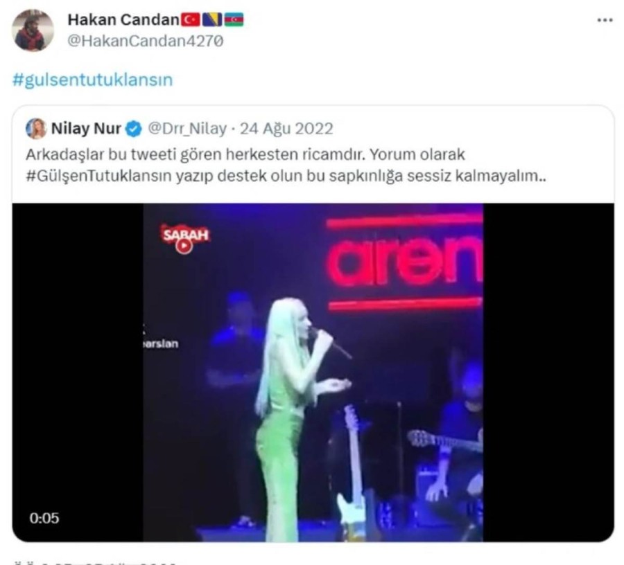 Hakan Candan'ın Gülşen'in tutuklanması için çağrıda bulunduğu ve oyuncu Merve Dizdar'ı da hedef aldığı görüldü.