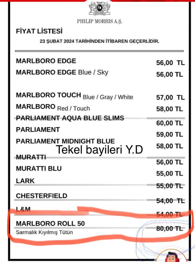Açıklamaya göre Malbora Roll 50 (Sarmalık kıyılmış tütün) 80 TL oldu.