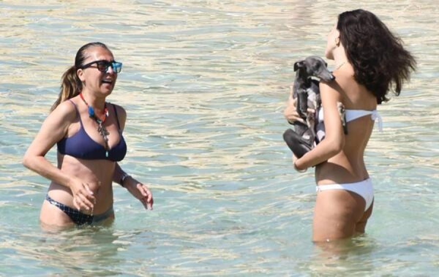 Türkay ile Dabak uzun süre şezlonglarında sohbet ettiler. Akşama doğru denize giren ikilinin keyifli halleri, objektiflere böyle yansıdı.
