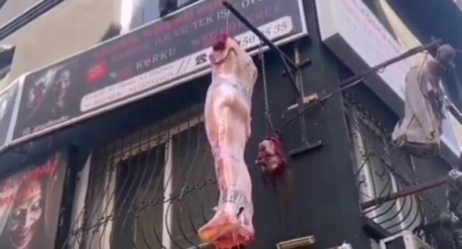 İzmir'in Konak ilçesi Alsancak semti 1485. Sokak'taki 'Azrail Köşkü Korku Evi' isimli işletmenin dış cephesine reklam amacıyla asılan bir kanlı baş, bir başı olmayan kanlı vücut maketi, bir kafatası, 3 korku mankeni, bir kanlı çocuk maketi, bir kanlı kol ve el maketi bir vatandaş tarafından cep telefonu ile kayda alınarak, sosyal medyada paylaşıldı.