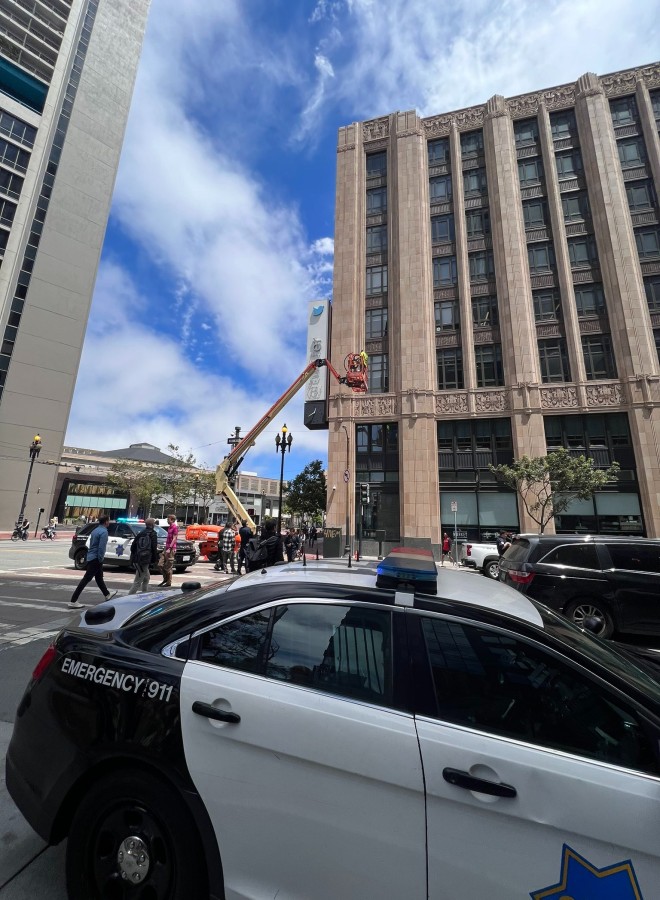 Elon Musk, Twitter genel merkez binasındaki logonun kaldırılması için de harekete geçti. Çağırılan vinç ile binanın dışındaki logonun sökülmesi istendi. Ancak bu girişim, polis müdahalesi ile sonuçlandı.