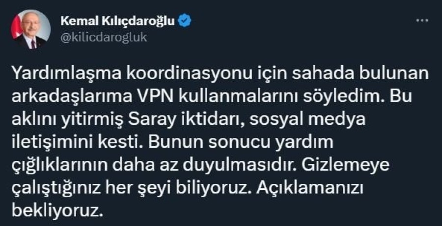Sosyal medya platformlarında yaşanan bu sınırlama üzerine CHP lideri Kemal Kılıçdaroğlu da Twitter hesabından açıklama yaptı ve VPN kullanımını önerdi: