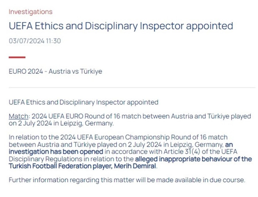 UEFA, Merih Demiral'ın Avusturya maçındaki gol sevinci nedeniyle uygunsuz davranış iddiasıyla soruşturma başlatıldığını duyurdu.