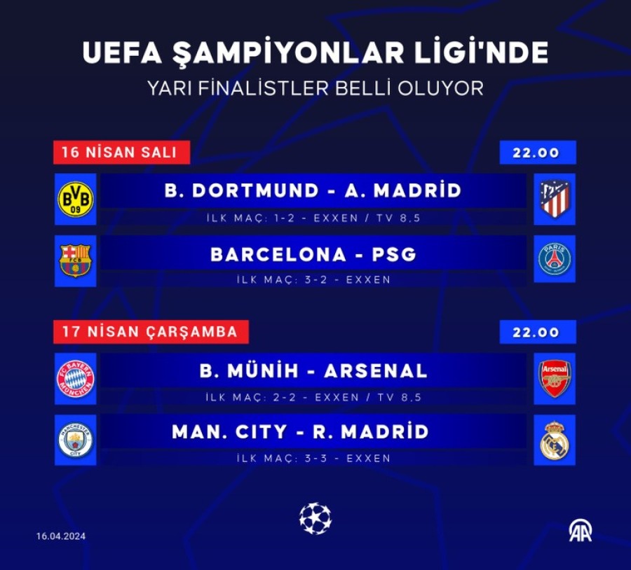 Avrupa futbolunun kulüp düzeyindeki en önemli organizasyonu Şampiyonlar Ligi'nde yarı finalistler yapılacak karşılaşmaların ardından belli olacak.