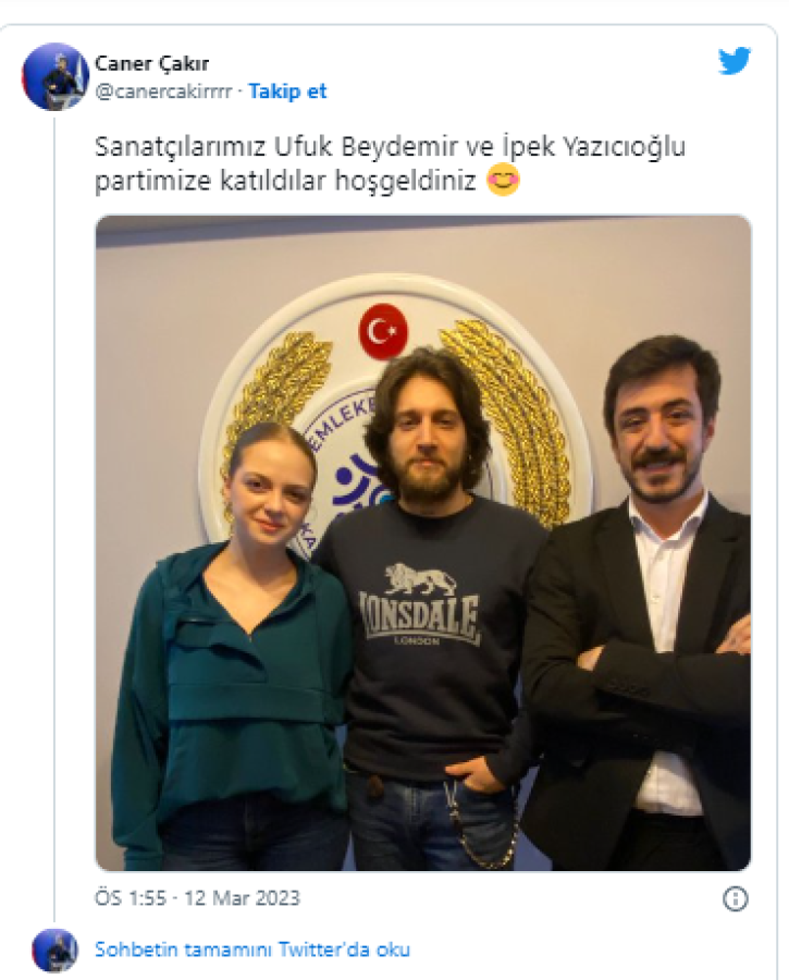 Haberi sosyal medya hesabından duyuran Memleket Partili Caner Çakır, "Sanatçılarımız Ufuk Beydemir ve İpek Filiz Yazıcı partimize katıldılar hoşgeldiniz" ifadelerini kullandı.