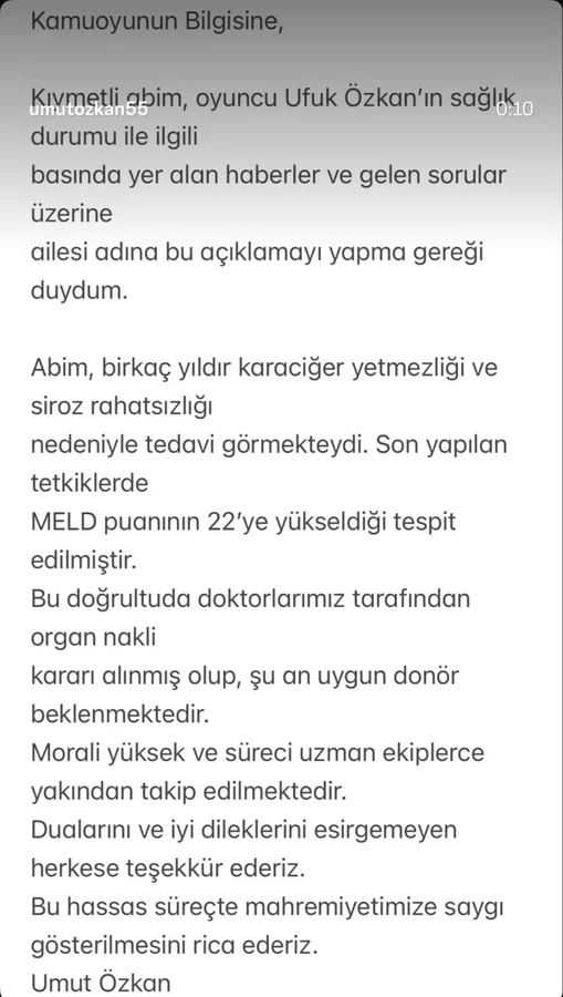 Uzun süredir karaciğer yetmezliği ve siroz tedavisi gören Ufuk Özkan'ın kardeşi Umut Özkan, sosyal medya hesabından yaptığı paylaşımda Özkan'ın yeniden hastaneye kaldırıldığını açıkladı. Umut Özkan, doktorların oyuncunun sağlık durumunun ciddi olduğunu ve acil karaciğer nakli gerektiğini belirttiğini aktardı.
