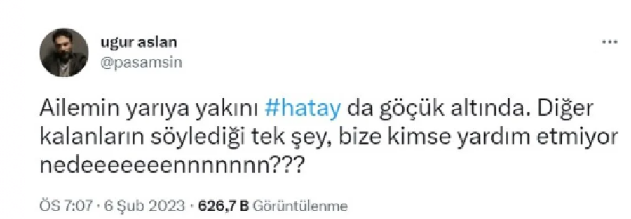 Tüm ülkeyi sarsan deprem sonrası çok sayıda ölü ve yaralının olduğu 10 ilde, arama kurtarma çalışmaları devam ederken 'Yargı' dizisinde rol alan Uğur Aslan da Hatay'daki ailesi için Twitter'dan paylaşım yaptı.