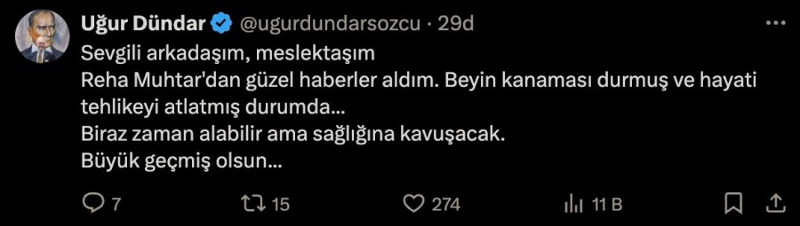 "Sevgili arkadaşım, meslektaşım Reha Muhtar'dan güzel haberler aldım. Beyin kanaması durmuş ve hayati tehlikeyi atlatmış durumda... Biraz zaman alabilir ama sağlığına kavuşacak. Büyük geçmiş olsun..."